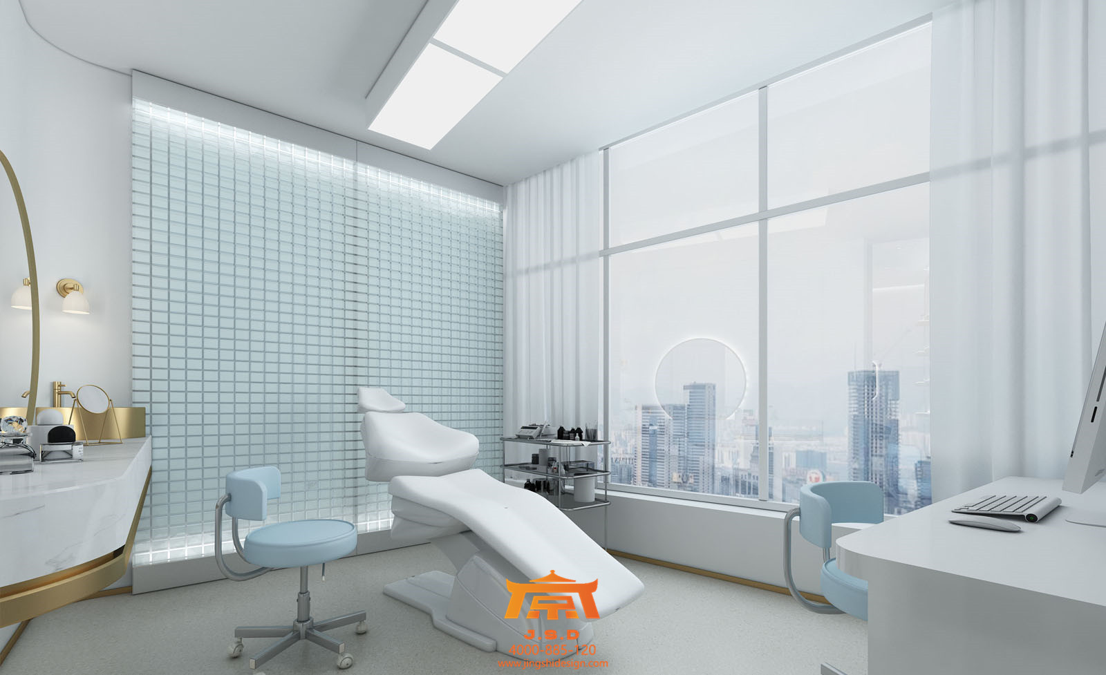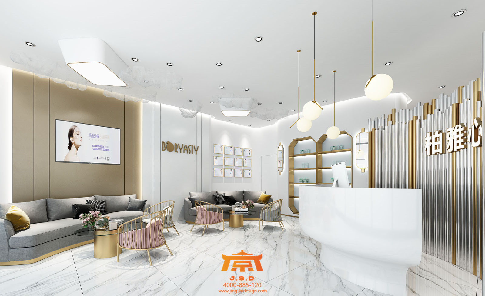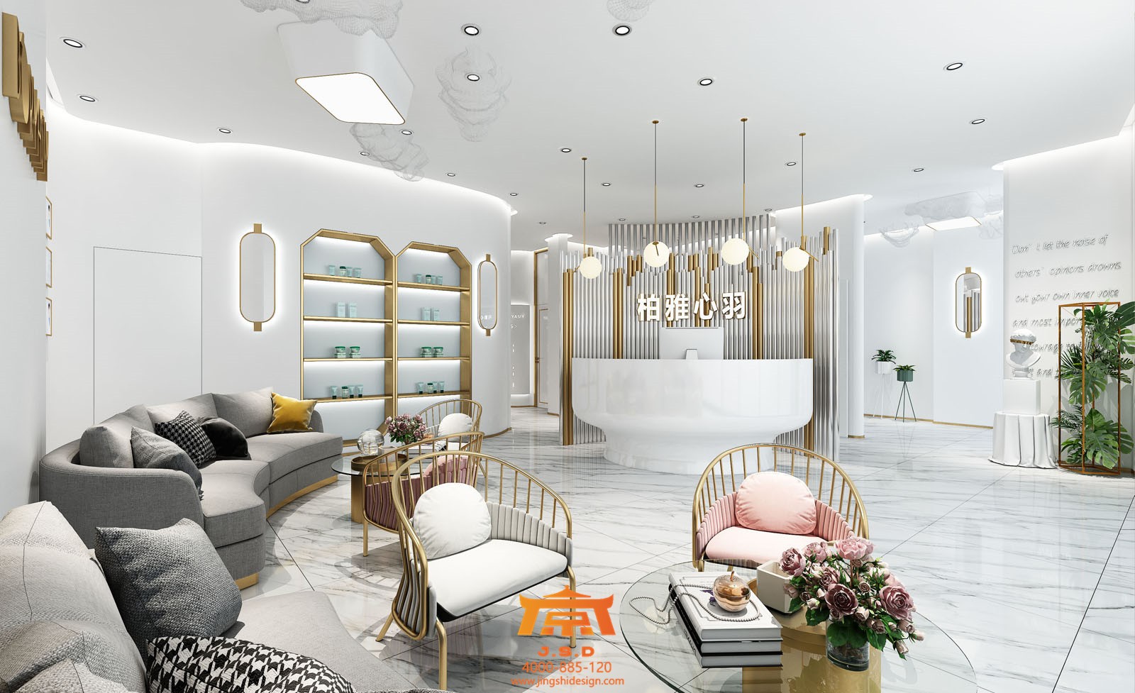 常年生活在北京的孩子對(duì)于成都這座城市還是抱有幻想的,提起霧都總有一股神秘力量在吸引著他們,成都人才輩出,藝術(shù)氛圍也不例外。第一家店整體風(fēng)格要求香檳金搭配醫(yī)療白,所謂的“網(wǎng)紅”風(fēng)格的標(biāo)配了,從視覺上此類風(fēng)格要有第一感受,整個(gè)空間簡約時(shí)尚,符合現(xiàn)階段年輕人的審美,但每一家網(wǎng)紅風(fēng)格都有自己的唯一性,進(jìn)入大廳陶瓷一般的接待臺(tái),金銀不銹鋼鋼管配合發(fā)光字,簡約石膏板吊頂,配合天花若隱若現(xiàn)云朵網(wǎng)狀造型,網(wǎng)紅氣質(zhì)越發(fā)濃厚。